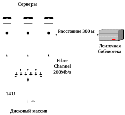 Строится на основе дисковых массивов с аппаратной реализацией RAID и интерфейсами FC, которые обладают возможностью непосредственного подключения нескольких серверов, а максимальный объем хранимой информации может достигать нескольких терабайт. Для обеспечения резервного копирования информации в рамках предлагаемого решения используются ленточные библиотеки с интерфейсом FC, что позволяет вынести их за пределы вычислительного центра и тем самым обеспечить сохранность данных и возможность их восстановления в случае локальных катастроф, например пожара. Для обеспечения высокого уровня надежности хранения данных у выбираемых моделей дисковых массивов дублированы все основные элементы конструкции.