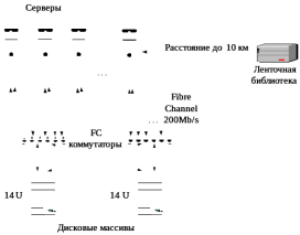 2. Инфраструктуру доступа серверов к устройствам хранения данных, которая создается в настоящее время на основе технологии "сеть хранения данных" (Storage Area Network – SAN). SAN является высокопроизводительной информационной сетью, ориентированной на быструю передачу больших объемов данных.