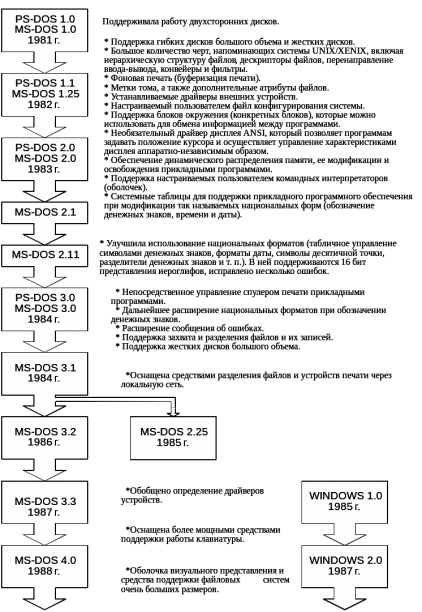 Модификации системы MS-DOS (3.1 и старше) носят скорее эволюционный, чем революционный характер. В версии 3.2, которая появилась в 1986 г., обобщено определение драйверов устройств, что значительно упростило средства поддержки новых магнитных носителей, таких как гибкий диск размером 3,5 дюйма. Система MS-DOS (версия 3.3), выпущенная в 1987 г. одновременно с началом выпуска персональных компьютеров IBM нового семейства PS/2, оснащена еще более мощными средствами поддержки работы клавиатуры на нескольких иностранных языках, включая соответствующие наборы символов печатающего устройства и шрифтов дисплея. Возможности версии 4.0, впервые представленной в 1988 г., значительно возросли благодаря оболочке визуального представления и средствам поддержки файловых систем очень больших размеров.