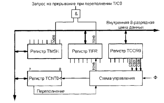 Схема работы таймера/счетчика Т/С0, представлена на рис. 4.1.