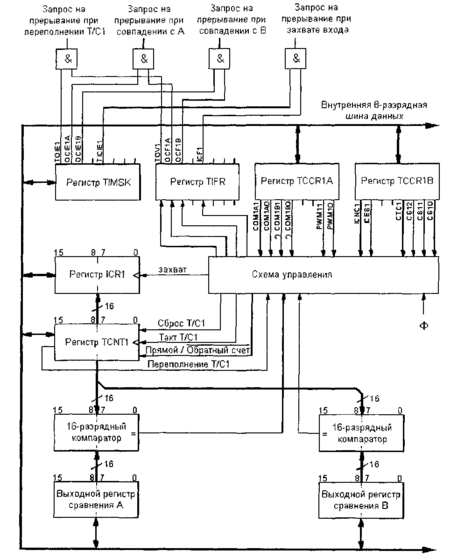 В дополнение к счетному регистру и регистру управления, он содержит регистр захвата по входу (ICR1) и два 16-ти разрядных регистра сравнения на выходе (в некоторых моделях микроконтроллеров регистр сравнения В отсутствует).