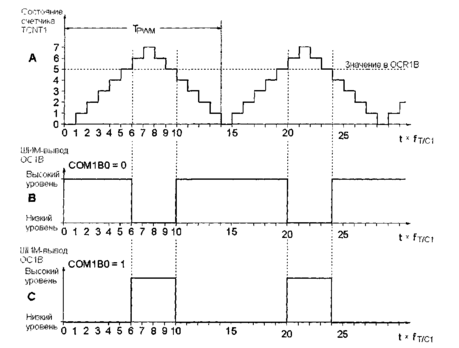 Регистр TCNT1 инкрементируется далее до тех пор, пока не будет достигнуто значение ТОР, которое при трехразрядной ШИМ составляет 7. Как только достигнуто значение ТОР, направление счета меняется на обратное, и регистр выполняет вычитание. После девятого тактового импульса, начиная от стартового значения 0, содержимое регистра TCNT1 опять совпадает с содержимым регистра OCR1B. На следующем тактовом импульсе на выходе ОС1В устанавливается уровень лог. 1.