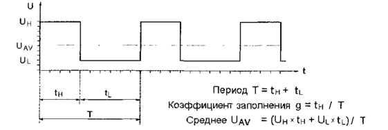Рис. 4.4. Определение периода Т, коэффициента заполнения g и среднего арифметического UAV прямоугольных импульсов напряжения U