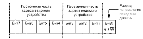 Выбор ведомого устройства, с которым хотело бы обмениваться данными ведущее устройство, осуществляется посредством первого байта, который всегда определяется как адрес ведомого устройства – первый байт последовательности данных. Он однозначно сопоставлен определенному устройству, подключенному к шине, и имеет длину 7 бит (разряды от 1 до 7). Теоретически, таким образом можно адресовать до 128 ведомых устройств, однако по определению некоторые адреса ведомых устройств имеют особое значение. Адрес ведомого устройства состоит из двух частей: постоянной и переменной (рис. 7.14).