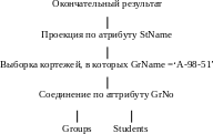 Например, на рисунке показано дерево рассматриваемого выше в этой главе запроса ("Получить список фамилий студентов, учащихся в группе А-98-51").