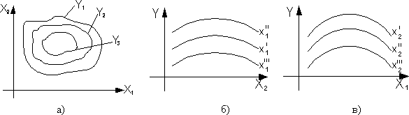 Рис. 3. Сечения поверхности отклика при фиксированных откликах (а) и переменных (б,в).