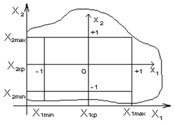 Эта операция заключается в выборе нового масштаба для кодированных факторов (рис. 5), причем такого, чтобы минимальное значение кодированных факторов соответствовало “-1”, а максимальное значение “+1”, а также в переносе начала координат в точку с координатами Х1ср, Х2ср, …, Хnср