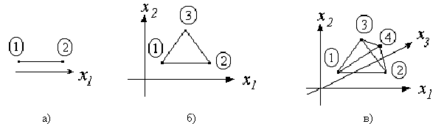 Рис. 11. Симплекс-план для n=1, N=2 (а); n=2, N=3 (б); n=3, N=4 (в)