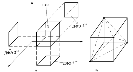 Графическое изображение планов ПФЭ 23 и ДФЭ 23-1 в факторном пространстве (для трех факторов - трехмерное пространство) представлено на рис. 10. План ПФЭ 23 представлен кубом с восемью узлами (точками плана), а возможные планы ДФЭ 23-1 – проекциями этого куба на три плоскости. То есть из восьми узлов выбираются четыре (рис. 10, а). Из куба можно также выбрать четыре точки из восьми, не лежащие в одной плоскости, и сформировать план ДФЭ 23-1 (рис. 10, б).