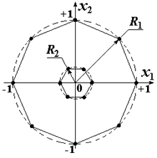 Например, в рототабельном плане при n=2 на основе правильного шестиугольника присутствуют 7 отличающихся точек: N0=6 точек на единичной окружности и n0=6 совпадающих точек в центре плана (рис. 16).