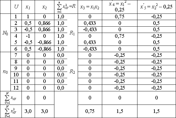 должна равняться радиусу R. Это может быть обеспечено, при выполнении условия ортогональности, только при соответствующем выборе числа наблюдений в центральной (нулевой) точке плана n0. Для РОЦКП n0 зависит от числа факторов n. Напомним, что в ОЦКП n0 = 1 для любого числа n.