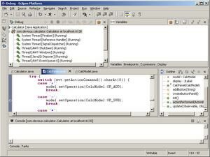 Создав однажды конфигурацию запуска своего приложения, вы можете запускать его вновь с помощью меню Run->Run History или кнопки Run на панели инструментов. Если вы потратите достаточно времени, "играя" с этим калькулятором, вы обнаружите, что он работает в основном правильно, но только с одном "но": он не хочет правильно выполнять операцию вычитания! Время пустить в ход отладчик исходного кода Eclipse и обнаружить эту злосчастную ошибку. Если вы следовали всем инструкциям, приведенным выше в этой статье, то вы можете запустить это приложение с отладчиком с той же конфигурацией, которую мы определили для обычного запуска. Для этого выберите в меню пункт Run->Debug History->Calculator.