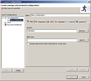 4. Нажмите кнопку Search... и выберите основным классом класс Calculator в поле Main class, или просто введите в поле ввода полное имя класса: com.devious.calculator.Calculator.