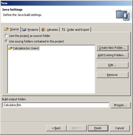 3. И, наконец, на завершающем этапе "мастер" создания нового проекта дает вам возможность определить директории, где будут храниться файлы исходного кода и class-файлы, определить подпроекты, которые могут быть использованы создаваемым нами, текущим проектом, а также любые библиотеки, которые мы предполагаем использовать в своем приложении. Установите переключатель на значение Use source folder contained in the project, после чего нажмите кнопку Create New Folder.... В качестве имени новой директории для хранения исходного кода введите src. Нажмите Yes, когда Eclipse спросит вас о том, изменить ли директорию с собираемым приложением на Calculator/bin.