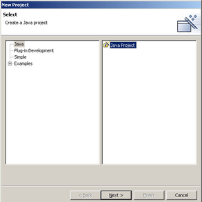 1. Выберите пункт меню File->New->Project..., чтобы начать создание вашего первого Java-проекта. В окне "мастера" выберите Java среди предложенных типов проектов из левого списка и Java Project в правом списке, после чего нажмите кнопку Next.