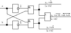 Простой пример схемы сравнения (компаратора) одноразрядных двоичных чисел a и b рис.5.22
