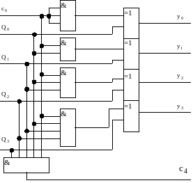 Инкрементор - это комбинационное устройство, которое ко входному многоразрядному числу Q прибавляет в случае необходимости