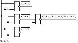 Пример 3.4. Синтезировать мажоритарный элемент на три входа в базисе ИЛИ-НЕ. У такого элемента значение выходного сигнала совпадает с значением большинства входных.
