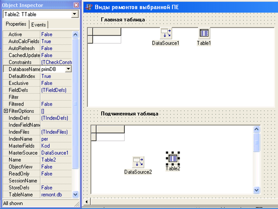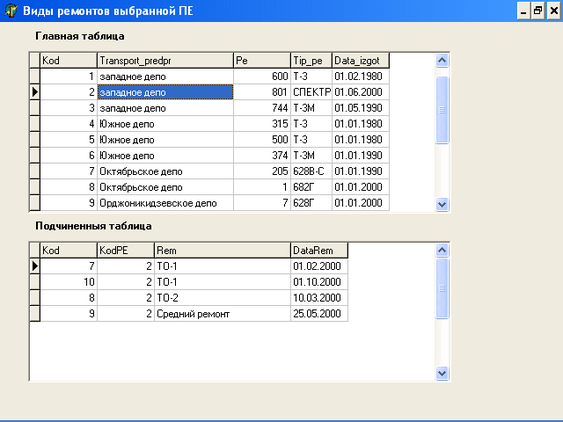 В верхней части формы (см. рис. 9) выводится список всех подвижных единиц (ПЕ), в нижней – сведения о ремонтах выбранной ПЕ. Для наглядности в наборы данных включены все поля таблиц, которые отображаются в компонентах DBGrid. При этом названия заголовков столбцов совпадают с названиями полей.