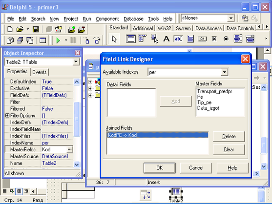 Рассмотрим пример вывода данных из главной и подчиненной таблиц (рис. 9). Для организации связи в качестве поля связи главной таблицы берется автоинкрементное поле Kod уникального кода. По этому полю построен главный ключ, значение которого автоматически формируется при добавлении новой записи и в пределах таблицы является уникальным. В подчиненной таблице полем связи является целочисленное поле KodPe, по которому построен вторичный индекс.
