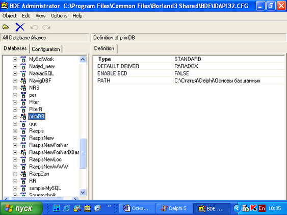 Программа BDE Administrator представляет собой администратор процессора баз данных BDE. Для вызова администратора BDE запускается файл bdadmin.exe. Администратор позволяет настраивать параметры БД и системные параметры (операционной системы). Параметры псевдонима: название, тип, путь. Параметры драйвера: тип, язык. Системные установки: установки по умолчанию, форматы даты, времени и числовые параметры.