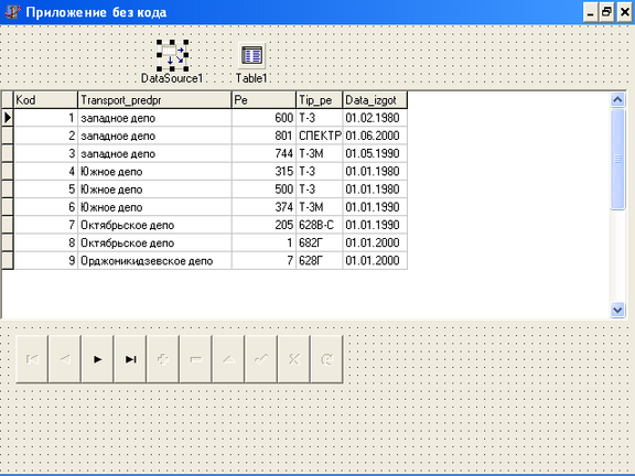 Вид формы приложения представлен на рис. 6. На форме расположены следующие компоненты: Table1, DataSource1, DBGrid1 и DBNavigator1.