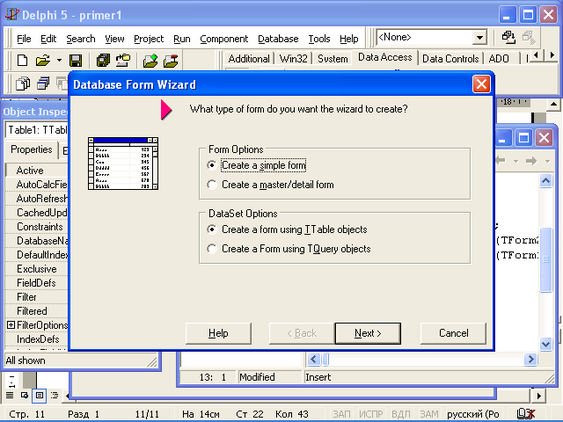 Мастер форм баз данных позволяет создавать формы для работы с отдельной таблицей и с взаимосвязанными таблицами, при этом можно использовать наборы данных Table и Query.