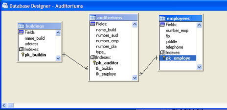 Создадим отношения между таблицами. Для этого в окне конструктора базы данных щёлкаем мышью на имени индекса PK_buildin таблицы Buildings к индексу FK_buildin таблицы Auditoriums.