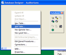 Теперь создадим базу данных и добавим в неё уже созданные свободные таблицы. В окне Диспетчера проектов на вкладке Data выберем пункт Databases и нажмём кнопку New. Появится окно, в котором выберем New Database (Новая база данных) и сохраним базу данных как Auditoriums.dbc. В появившемся окне Database Designer (Построитель базы данных) выберем из контекстного меню Add Table… (Добавить таблицу)
