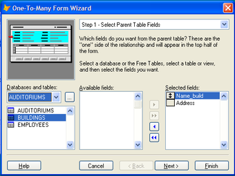 Создадим форму для двух связанных таблиц Аудитории (Auditoriums) и Корпуса (Buildings)(Рис. 2.15.10.). Для этого выберем мастера создания формы, использующего связанные таблицы One-toForm Wizard.
