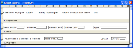 Для создания отчётов нужно в окне Диспетчера проектов перейти на вкладку Documents, где выбрать пункт Reports(Отчёты) и нажать кнопку New. После этого откроется диалоговое окно New Report (Новый отчёт) Выберем New Report. Появится окно конструктора отчётов Report Designer. Определим среду данных для отчёта, для чего выберем из контекстного меню пункт Data Environment (Среда данных). Щёлкнем правой кнопкой мыши в окне среды данных и выберем в появившемся контекстном меню пункт Add…(Добавить). Добавим таблицы Auditoriums и Buildings и установим связи между ними. Разместим надписи столбцов в области Page Header (Верхний колонтитул) окне конструктора отчётов, а в поле Detail разместим поля из таблиц. Для добавления поля выберем его из окна среды данных отчёта или поместим объект Field (Поле) из элементов управления отчётом Report Controls. При этом появится диалоговое окно Report Expression (Выражение для отчёта), затем введём в поле Expression наименование требуемого поля. В области Page Footer поместим значение, указывающее общее количество строк в отчёте и выведем текущую дату. Для того чтобы вывести значение числа строк, поместим в полосу Page Footer объект Field (Поле). В окне Report Expression нажжём кнопку Calculations (Вычисления), после чего появится диалоговое окно Calculate Field (Вычисляемое поле), в котором выберем операцию Count (Количество), а в поле Expression укажем наименование первого поля – Name_build. Для того, чтобы вывести текущую дату необходимо поместить объект Field (Поле) и в окне Report Expression ввести в поле Expression выражение DATE() – функцию по вычислению текущей даты. Рядом добавим соответствующие надписи, поместив на макет формы объекты Label (Надпись) и введя требуемые надписи. Сохраним отчёт.