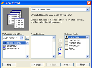 Создадим три формы по одной для каждой таблицы при помощи мастера форм. Для создания формы нужно в окне Диспетчера проектов перейти на вкладку Documents, где выбрать пункт Form и нажать кнопку New. Выберем Form Wizard, затем выберем мастера создания формы с одной таблицы Form Wizard. На первом шаге необходимо выбрать таблицу и поля, которые будут применяться в форме. Укажем таблицу AUDITORIUMS базы данных AUDITORIUMS (не свободную таблицу, потому, что мы её уже добавили в базу данных) и выберем все поля, переместив их в список Selected fields (Выбранные поля).