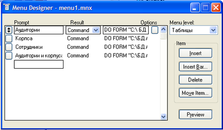 Для создания меню нужно в окне Диспетчера проектов перейти на вкладку Other (Другое), где выбрать пункт Menus (Меню) и нажать кнопку New. После этого откроется диалоговое окно New Menu (Новое меню) Выберем Menu. Появится окно конструктора меню Menu Designer. Введём названия пунктов меню в поле Prompt (Наименование), а в раскрывающемся списке Result (Результат) определим действия, происходящие при выборе пункта меню. Введём подменю «Таблицы», для чего в поле Prompt введём название пункта меню «Таблицы», а в списке Result укажем Submenu (Подменю), затем нажмём на кнопку Create (Создать) после чего в раскрывающемся списке Menu Level (Уровень меню) появится название созданного подменю. Все остальные пункты, созданные на этом уровне, будут пунктами подменю для пункта меню «Таблицы». Создадим пункт «Аудитории». Для этого в списке Result укажем Command (Команда) и введём «DO FORM «c:\бд auditoriums\формы\auditoriums.scx»«, что значит открыть форму auditoriums.scx. Аналогично создадим пункты для открытия трёх других форм.