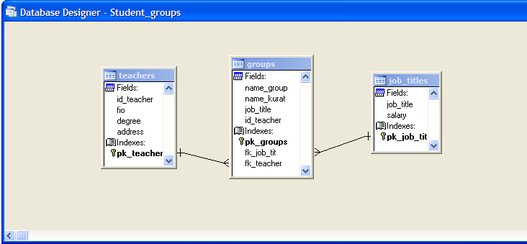 Создадим отношения между таблицами. Для этого в окне конструктора базы данных щёлкаем мышью на имени индекса PK_Teacher таблицы Teachers и переносим к индексу FK_Teacher таблицы Groups. Также создадим отношение между таблицами Job_titles и Teachers.