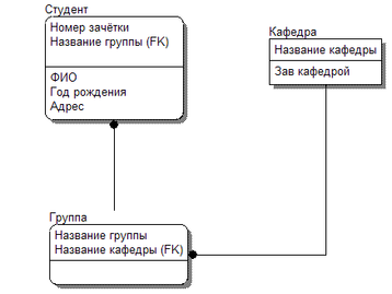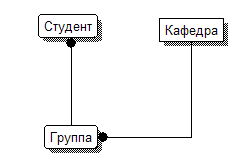 Сущности «Группа» и «кафедра» связаны по полю «Название кафедры», значение которого для сущности «Кафедра» уникально и является её первичным ключом.