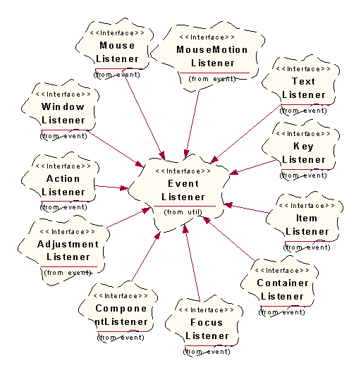 Классы, ответственные за обработку событий в JDK 1.1, реализуют интерфейсы “прослушивания” событий (listeners):