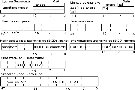 • дальнего типа — 48-разрядный логический адрес, состоящий из двух частей: 16-разрядной сегментной части — селектора, и 32-разрядного смещения.