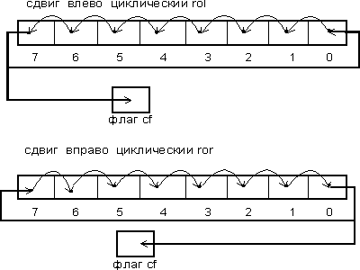 Как видно из рис., команды простого циклического сдвига в процессе своей работы осуществляют одно полезное действие, а именно: циклически сдвигаемый бит не только вдвигается в операнд с другого конца, но и одновременно его значение становиться значением флага cf.