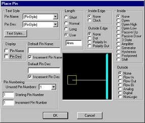 Выводы элементов схемы выполняются при помощи команды Place Pin (Вывод), которая позволяет изобразить на УГО (в том числе и микросхем) выводы и снабдить эти изображения необходимой цифровой, текстовой или графической информацией. Длина вывода и размер шрифта (текстовый стиль) для сопровождающих надписей либо назначаются пользователем, либо выбираются из стандартного ряда.