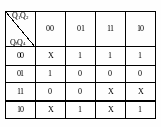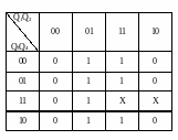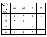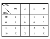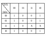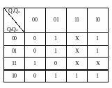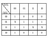 В этих картах по две клетки (комбинации 1111 и 1110) оказались не заполненными: эти клетки соответствуют неиспользованным кодовым комбинациям. Совокупность четырех триггеров, образующих регистр, может находиться в одном из шестнадцати состояний: 24=16, из которых для формирования кодов импульсов на выходе ЦА используется только четырнадцать. Эти клетки можно заполнить символами "Х". Это означает, что минимизируемая функция может при данном наборе аргументов Q1…Q4 принимать любое значение: 0 или 1.