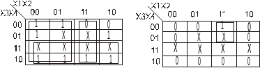 На диаграммах Вейча-Карно безразличные состояния входных переменных, отмеченные символом “х” и включенные в контуры, считаются единичными, а вне контуров – нулевыми.