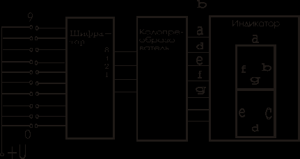 Рис.7. Структурная схема шифратора и кодопреобразователя для управления 1-разрядным 7-сегментным индикатором