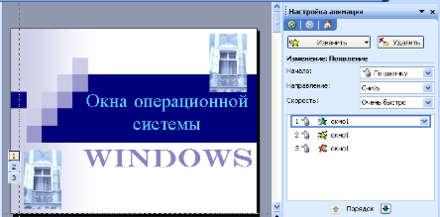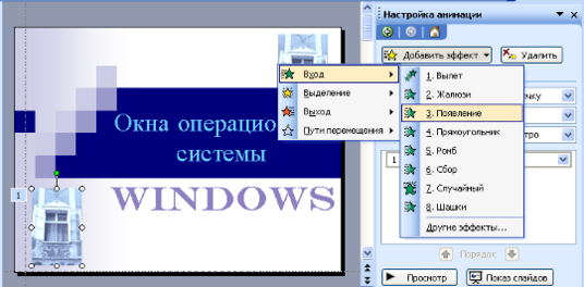 Задайте следующие эффекты для изображения окна первого слайда: