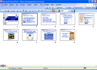 Режим сортировщика слайдов выводит пиктограммы всех слайдов, которые можно, перетаскивая, менять местами. Когда вы выполняете перетаскивание, появляется вертикальная линия, показывающая в каком месте сортировщик вставит слайд.