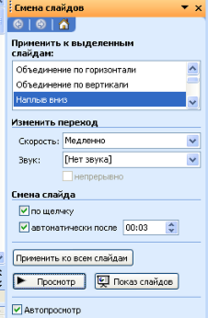 С помощью раскрывающегося списка Скорость, расположенного ниже списка эффектов можно изменить время действия выбранного эффекта (Медленно, Быстро, Средне). В опции Смена слайда можно задать временной интервал демонстрации данного слайда, для этого выбираем Автоматически после и указываем время в секундах. Если вы планируете демонстрировать презентацию реально присутствующей аудитории, убедитесь в том, что выбрана опция По щелчку. После выбора всех параметров нажимаем кнопку Применить ко всем слайдам, если следует применять один и тот же эффект ко всем слайдам презентации.