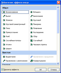 С помощью раскрывающегося списка Добавить эффект можно установить тип анимационного процесса при появлении объекта на слайде. Эффекты могут применяться при появлении (вход) или исчезновении объекта (выход), а также могут применяться для акцентирования внимания на данном объекте (выделение). Выбранный эффект можно просмотреть с помощью кнопки Просмотр.