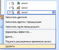 Обратите внимание в рабочей области появились три кнопки с порядковыми номерами выбранных эффектов, а в области задач список выбранных эффектов. Щелчком по любому пункту этого списка (или по соответствующей кноке в рабочей области) можно инициировать появление кнопки раскрывающегося списка команд справа от названия эффекта в списке, который позволяет определять дополнительные параметры эффекта, а также удалять их.