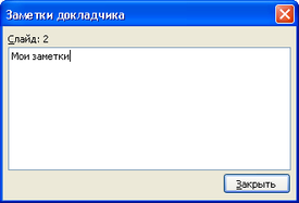 Рассмотрим ещё некоторые другие возможности, предоставляемые меню режима Показ слайдов. Программа Power Point позволяет делать пометки к слайдам непосредственно во время просмотра презентации при помощи команды меню Экран - Заметки докладчика. После выполнения этой команды на экране появляется окно Заметки докладчика, служащее для ввода с клавиатуры заметок к текущему слайду.