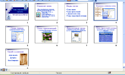 Переместите слайд «Основные элементы окна» на новое место – после слайда «Виды окон» . Проверьте последовательность расположения слайдов: