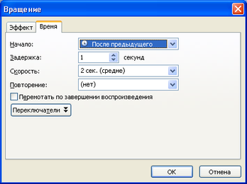Пункт Параметры эффекта позволяет уточнить порядок появления и время задержки до выполнения следующего эффекта.